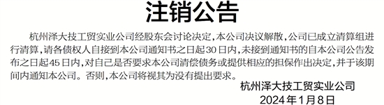 杭州泽大技工贸实业公司经股东会讨论决定,本公司决议解散,公司已成立清算组进行清算,请各债权人自接到本公司通知书之日起30日内,未接到通知书的自本公司公告发布之日起45日内,对自己是否要求本公司清偿债务或提供相应的担保作出决定,并于该期间内通知本公司。否则,本公司将视其为没有提出要求。