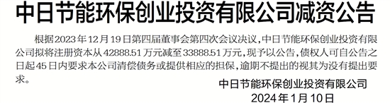 根据2023年12月19日第四届董事会第四次会议决议,中日节能环保创业投资有限公司拟将注册资本从42888.51万元减至33888.51万元,现予以公告,债权人可自公告之日起45日内要求本公司清偿债务或提供相应的担保,逾期不提出的视其为没有提出要求。