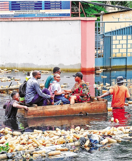 下图为人们在刚果(金)首都金沙萨被洪水淹没的道路上乘小船出行。 新华社发