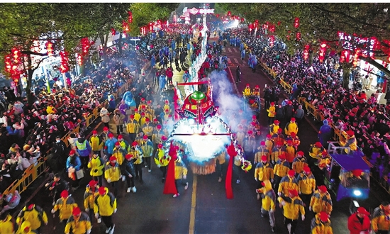 2月23日晚,“龙腾蟹乡·福满三门”群众文化活动在台州市三门县热闹上演,杨家板龙、高枧牡丹龙等非遗项目上街巡游,吸引了众多群众观看。