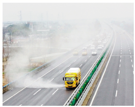 2月23日,浙江交通集团湖州管理中心采取吹雪车开道、预警车压道护送的方式,将社会车辆护送至安全路段。 拍友 吴世强 摄