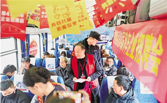 | 2月26日,广州白云开往宁波的K210次甬广列车上,浙江省总工会联合杭州客运段专为来浙务工人员举办了第4届列车企业招聘会。乘务人员和来自德清县钟管镇总工会的志愿者向旅客发放企业岗位信息。 本报记者 魏志阳 拍友 蔡俊 王椰萍 摄 |