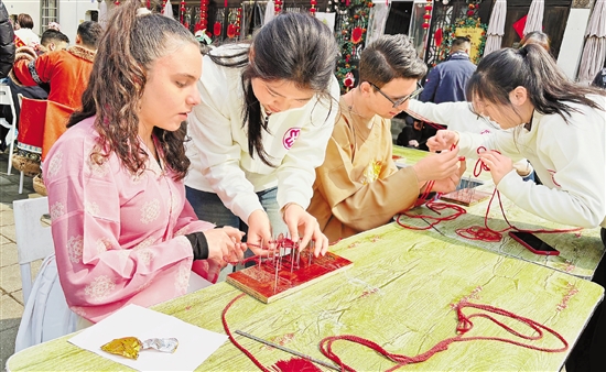 3月7日,来自摩洛哥等国家的10名女性友人在义乌举办的“三八”国际妇女节活动中体验中国文化,学做中国结。