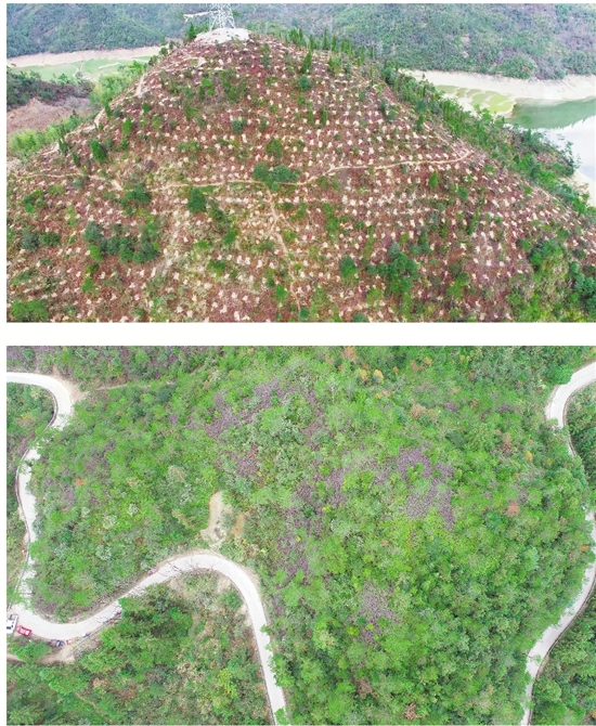 莲都区碧湖镇高溪水库旁的山坡复绿前(上图)后(下图)。 受访者供图