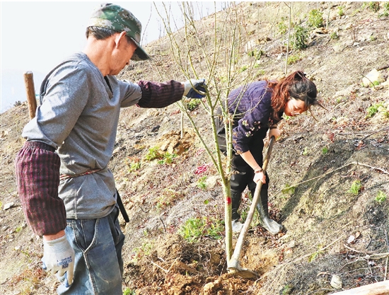记者(右)和造林员在山坡上种树。 拍友 柳松青 摄