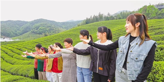 绍兴市曲艺家协会副主席陈祥平(右一)在茶园教村民们唱莲花落。