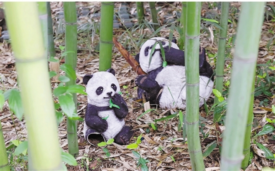 村内的竹林,因为设置了熊猫公仔而变得活泼起来。