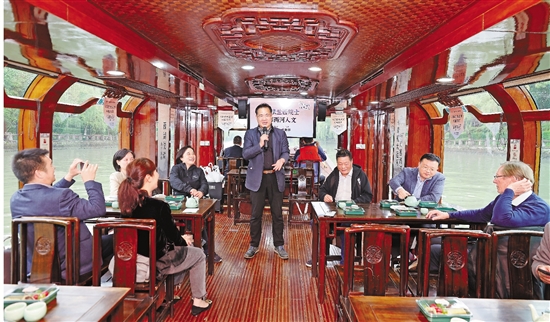 4月19日,作为杭州市“西湖悦读”系列活动之一,一场主题为“与法兰西院士聊两河人文”的分享会在运河画舫上热烈进行。 本报记者 魏志阳 摄