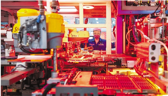 煤山镇一企业内,机械臂正在生产太阳能光伏板。