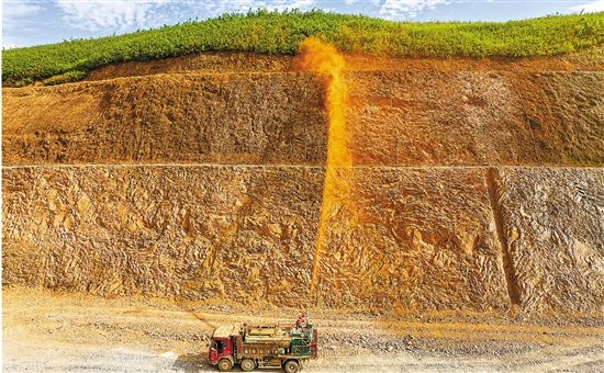 煤山镇千井湾矿区,工人正在往矿山岩壁喷涂带有植物种子的复合泥,生态修复废弃矿山。