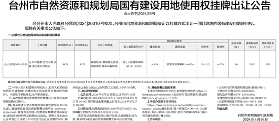 经台州市人民政府台供地[2024]30010号批准,台州市自然资源和规划局决定以挂牌方式出让一(幅)地块的国有建设用地使用权。现将有关事项公告如下: