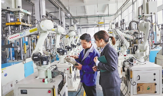 农行永康市支行客户经理走访“专精特新”企业,了解企业全智能生产线。