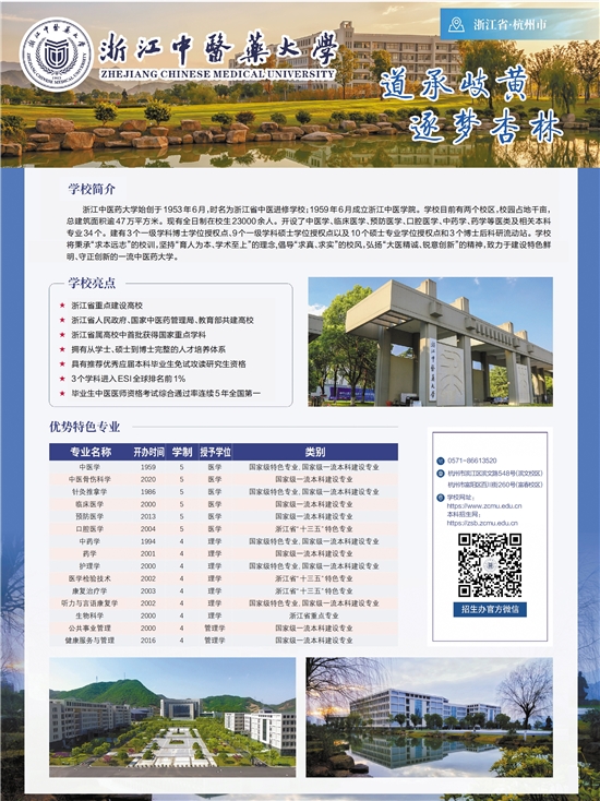 浙江中医药大学始创于1953年6月,时名为浙江省中医进修学校;1959年6月成立浙江中医学院。学校目前有两个校区,校园占地千亩,总建筑面积逾47万平方米。现有全日制在校生23000余人。开设了中医学、临床医学、预防医学、口腔医学、中药学、药学等医类及相关本科专业34个。建有3个一级学科博士学位授权点、9个一级学科硕士学位授权点以及10个硕士专业学位授权点和3个博士后科研流动站。学校将秉承“求本远志”的校训,坚持“育人为本、学术至上”的理念,倡导“求真、求实”的校风,弘扬“大医精诚、锐意创新”的精神,致力于建设特色鲜明、守正创新的一流中医药大学。