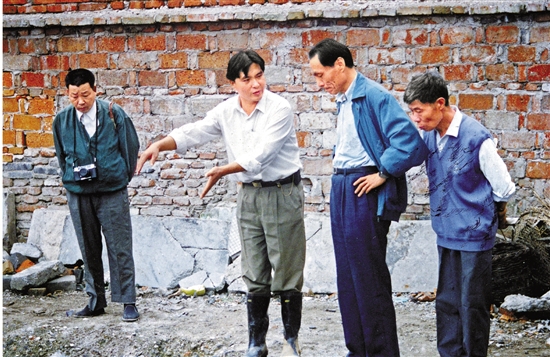 杜正贤(左二)为中国考古学泰斗严文明(左三)介绍南宋太庙考古发掘现场。