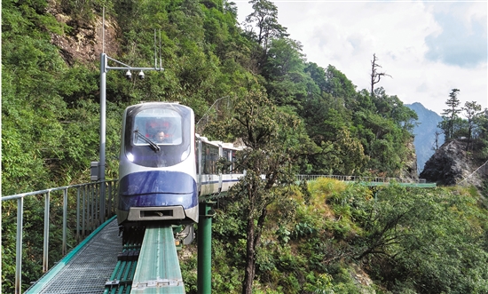 7月10日,“悬崖动车”行驶在江西大觉山景区。