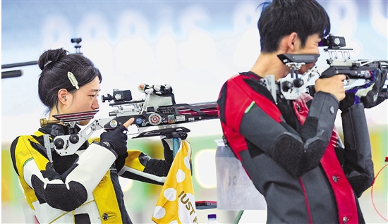 7月26日,中国射击队队员黄雨婷(左)和盛李豪在训练中。 新华社记者 鞠焕宗 摄