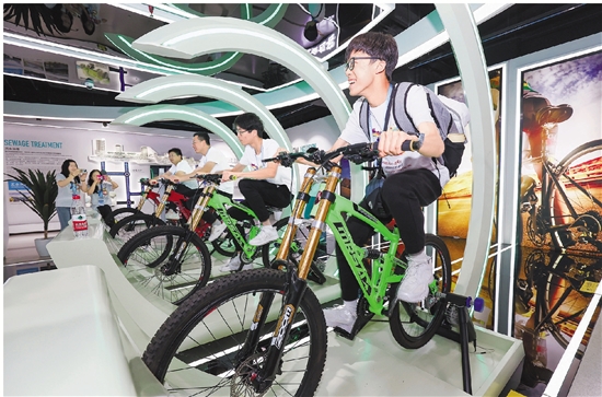 7月25日,参加港澳青年浙江行活动的港澳青年走进德清县地理信息科技馆,感受地信科技魅力。图为港澳青年正在体验自行车骑行。 拍友 王树成 摄
