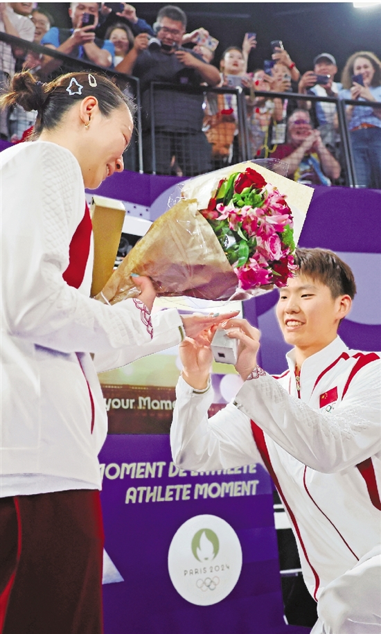 ◀ 8月2日,在巴黎奥运会羽毛球混合双打决赛中,中国组合郑思维/黄雅琼夺得金牌。在颁奖仪式后,中国羽毛球运动员刘雨辰向黄雅琼在赛场上求婚。 新华社记者 陈斌 摄