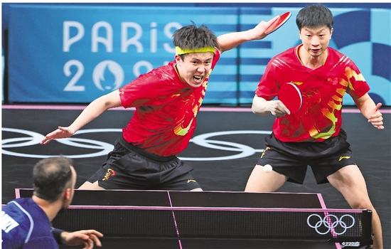 8月8日,中国组合马龙(右)/王楚钦在乒乓球男团半决赛中。 新华社记者 刘续 摄