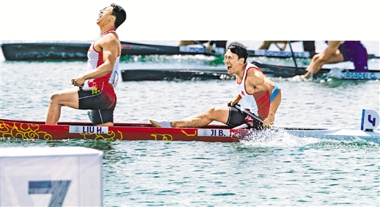 8月8日,中国组合刘浩/季博文(右)在比赛后庆祝。 本报特派记者 姚颖康 摄