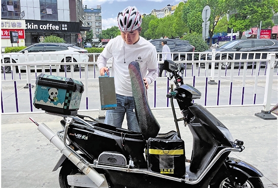 一名外卖骑手正在安装刚从换电柜中取出的电池。 共享联盟·义乌 骆红婷 摄