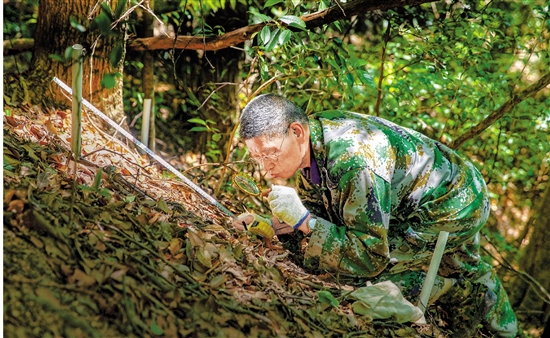 姜永清匍匐在林地里观察幼苗。