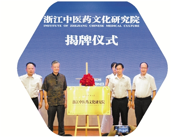 中国工程院院士、国医大师王琦(左二),省社科联主席盛世豪(右二),浙江中医药大学党委书记黄文秀(右一),校长陈忠(左一)为中医药文化研究院揭牌。