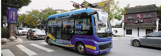 11月18日,一辆无人驾驶小巴士行驶在乌镇街头。 本报记者 魏志阳 倪雁强 姚颖康 摄