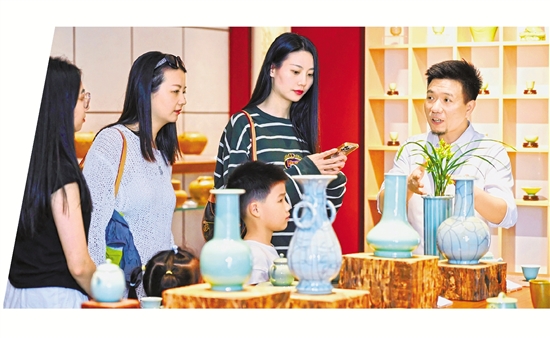 在德清窑艺术馆,浙江省工艺美术大师王军港(右一)为参观的游客讲解(资料照片)。