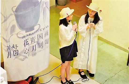 返乡青年潘佳鑫(右)在莫干山青芷粮仓咖啡空间举办“花好月圆陶瓷中国画作品展”(资料照片)。