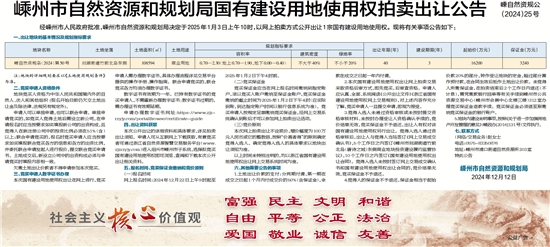 经嵊州市人民政府批准,嵊州市自然资源和规划局决定于2025年1月3日上午10时,以网上拍卖方式公开出让1宗国有建设用地使用权。现将有关事项公告如下: