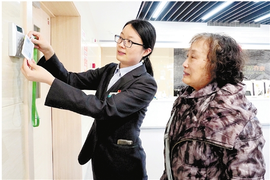 农行浙江省分行工作人员指导老年客户使用数字人民币硬钱包。