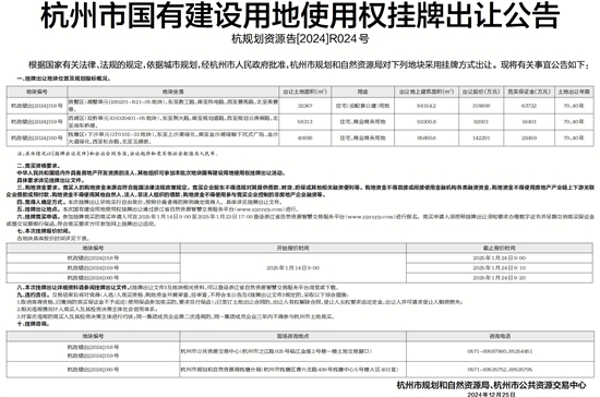 [地块编号 开始报价时间 截止报价时间 杭政储出[2024]158号 2025年1月14日9∶00 2025年1月24日9∶00 杭政储出[2024]159号 2025年1月24日9∶10 杭政储出[2024]160号 2025年1月24日9∶20 ]