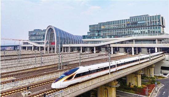 1月5日零时起,全国铁路实施2025年第一季度列车运行图。本次调图杭州西站充分利用沪苏湖、杭温等新高铁线路,提升运输能力,旅客列车增加42.5对,达到130.5对,创开站以来历史新高。图为1月5日15时10分,杭州西站首开前往香港西九龙的G99次列车。 本报记者 董旭明 摄
