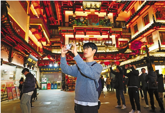 2024年12月25日,韩国游客金敏炯在上海豫园商城拍照。 新华社记者 王翔 摄