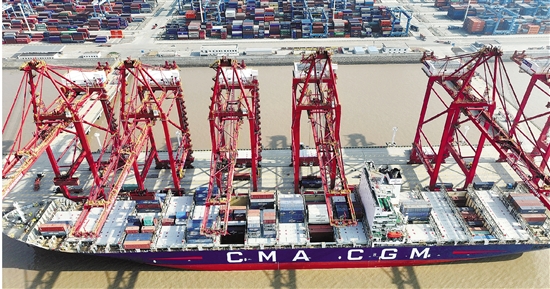 1月4日,宁波舟山港金塘港区大浦口集装箱码头车来船往,一片繁忙景象。 拍友 邹训永 摄