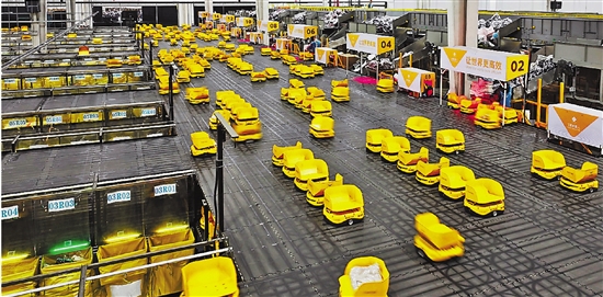 德清县快鱼服饰有限公司华东物流中心,分拣“小黄人”机器人正在精准配送。 本报记者 魏志阳 实习生 裴堃宇 拍友 凌俐云 摄