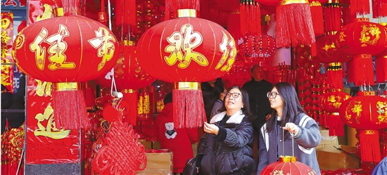 1月15日,市民正在台州市路桥区路桥街道市场街选购灯笼、春联等新年饰品,喜迎新春佳节。