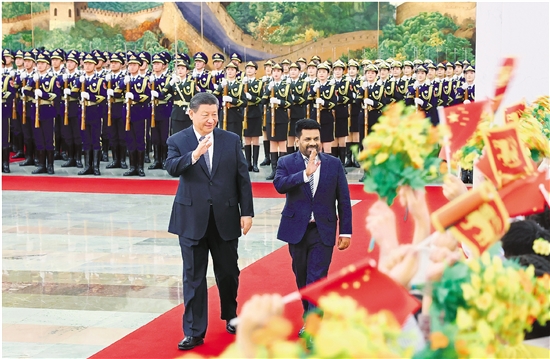 1月15日下午,国家主席习近平在北京人民大会堂同来华进行国事访问的斯里兰卡总统迪萨纳亚克举行会谈。这是会谈前,习近平在人民大会堂北大厅为迪萨纳亚克举行欢迎仪式。 新华社记者 姚大伟 摄