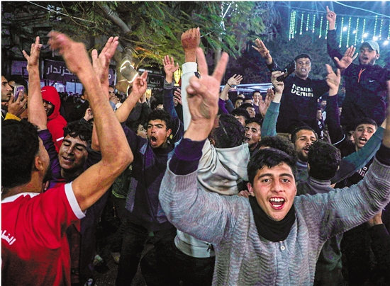 人们在加沙地带代尔拜拉赫庆祝停火协议达成。 新华社发