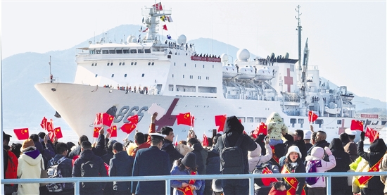 1月16日,中国海军“和平方舟”号医院船圆满完成“和谐使命—2024”任务,顺利返回浙江舟山某军港,任务官兵家属在码头上迎接。 新华社发(桂江波 摄)