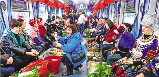 | 新鲜的农产品、喜庆的车厢、特色的民族歌舞、精美的非遗展示……1月18日,2025年全国乡村“村晚”示范展示活动暨“村火车上的村T村晚”启动仪式,在贵阳开往玉屏的5640次“慢火车”上举行。往返于贵阳与玉屏之间的5640/39次列车,是一趟穿行于贵州少数民族地区、逢站必停的“慢火车”。近年来,搭上这趟“慢火车”外出卖菜的村民较多,列车成了热闹的“移动集市”,是乡亲们走亲访友的“幸福快车”,更是把大山里的农特产品送到山外售卖的“致富快车”,被村民们称为“村火车”。 新华社记者 杨文斌 摄 |