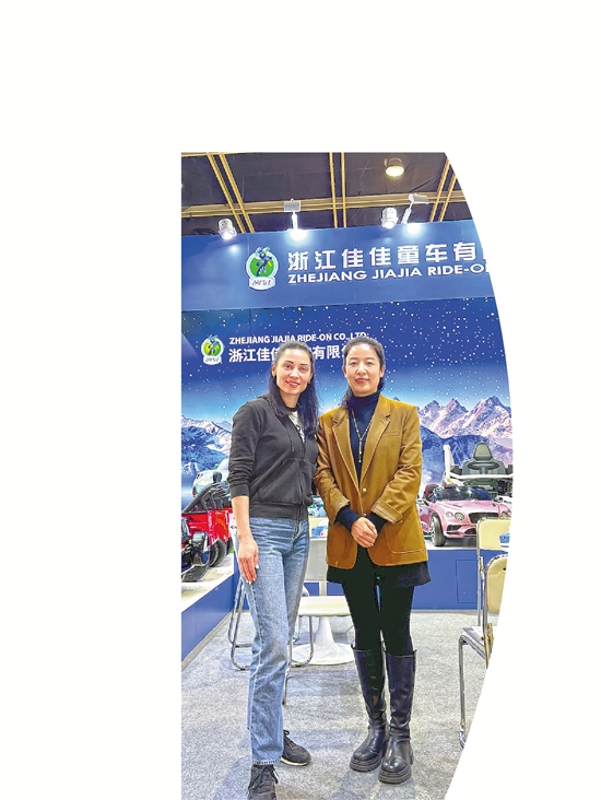 香港玩具展上,嘉兴企业浙江佳佳童车有限公司相关负责人(右一)与客户合影。