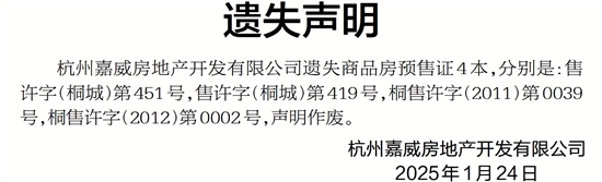 杭州嘉威房地产开发有限公司遗失商品房预售证4本,分别是:售许字(桐城)第451号,售许字(桐城)第419号,桐售许字(2011)第0039号,桐售许字(2012)第0002号,声明作废。