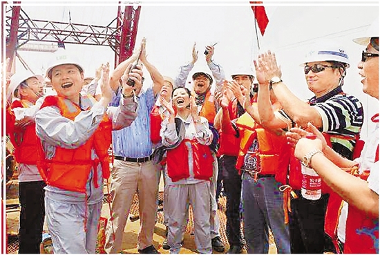 2016年7月,由林东团队历时8年研发的LHD海洋潮流能发电项目首期1兆瓦机组在舟山顺利下海,林东(左二)和同事一起庆祝。