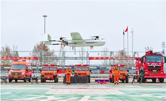 | 1月25日,在金华市应急救援综合训练基地,金华市无人机应急消防救援大队和国家消防局浙江机动队驻金华分队的队员们开展森林防灭火扑救演练。本次演练紧贴实战背景,通过使用各种智能无人机装备开展空地协同扑救,提升森林火情应急处置能力。金华市无人机应急消防救援大队于2024年10月29日挂牌成立,是全省首支无人机应急消防救援大队。图为一架中型复合翼通信无人机进行空中图传作业。 本报记者 金思成 吉文磊 通讯员 陈怡滢 文/摄 |