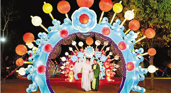 | 1月25日晚,在金华市金东区琐园国际研学村,璀璨花灯扮靓古村,喜迎蛇年春节。此次展出的花灯由四川自贡非遗团队精心打造。图为灯会现场,身着白娘子和小青造型服饰的工作人员穿梭其间,与游客互动。 本报记者 潘秋亚 拍友 时补法 摄 |