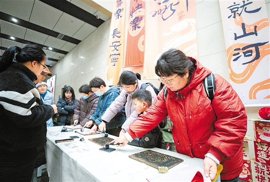 在衢州市博物馆,市民、游客体验“蛇全蛇美 画蛇添福”版画拓印。 本报记者 钱洁瑗 摄