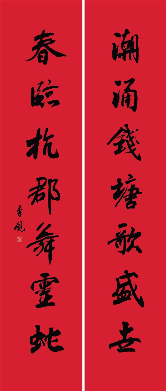 春联 《潮涌钱塘歌盛世 春临杭郡舞灵蛇》 李砚 书