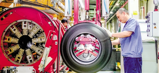 2月7日,建德市下涯镇的中策橡胶(建德)有限公司车间里,一排排机器轰鸣,几秒钟时间,一套轮胎制品就从自动化生产线上下线。 本报记者 彭鹏 拍友 陈鑫 摄